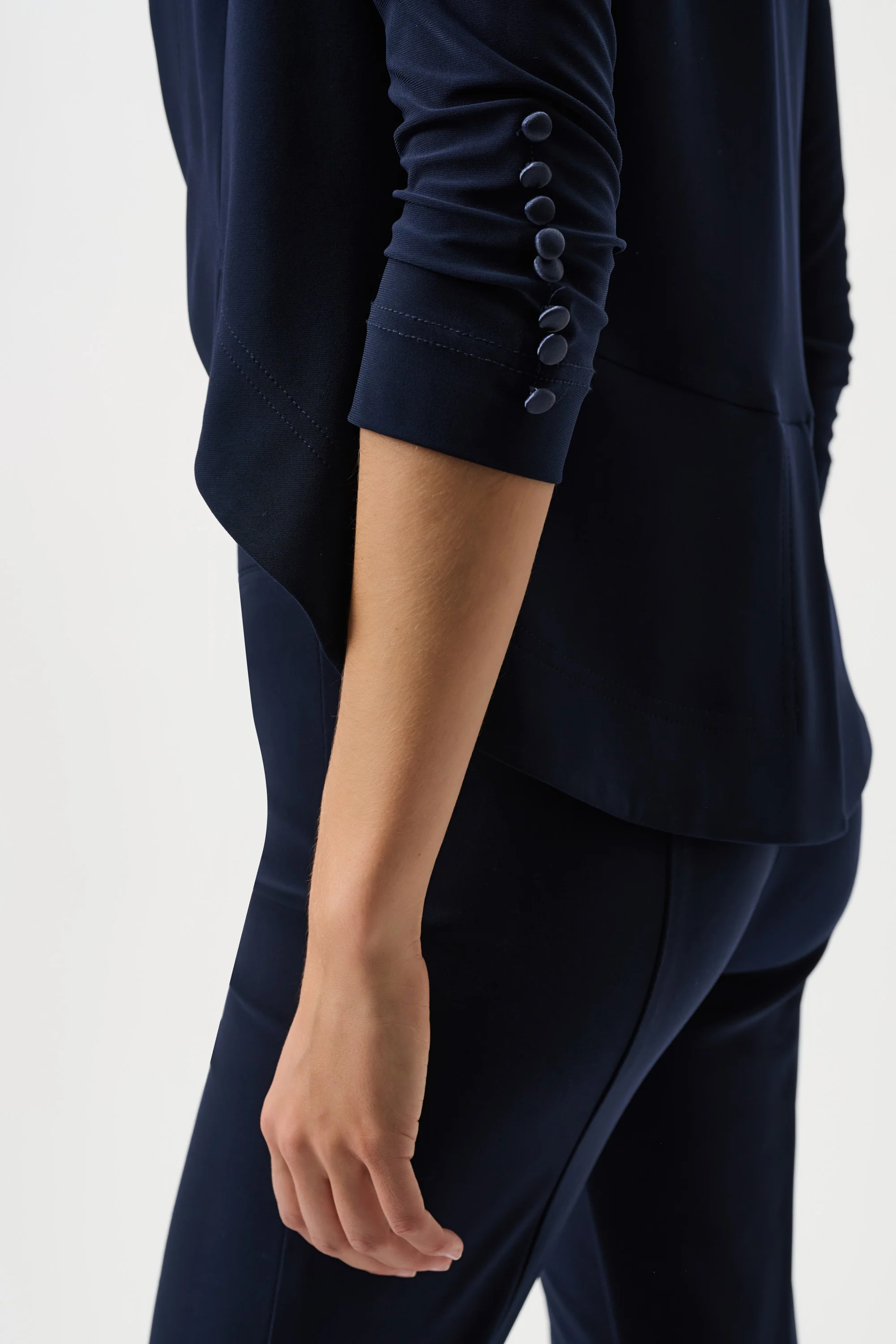 A sharply-styled tux overpiece that showcases clean lines and timeless sophistication. The cropped front cinches pointedly at the waist, while the back flows below the hips, highlighting its flattering fit. Covered buttons adorn the three-quarter sleeves.