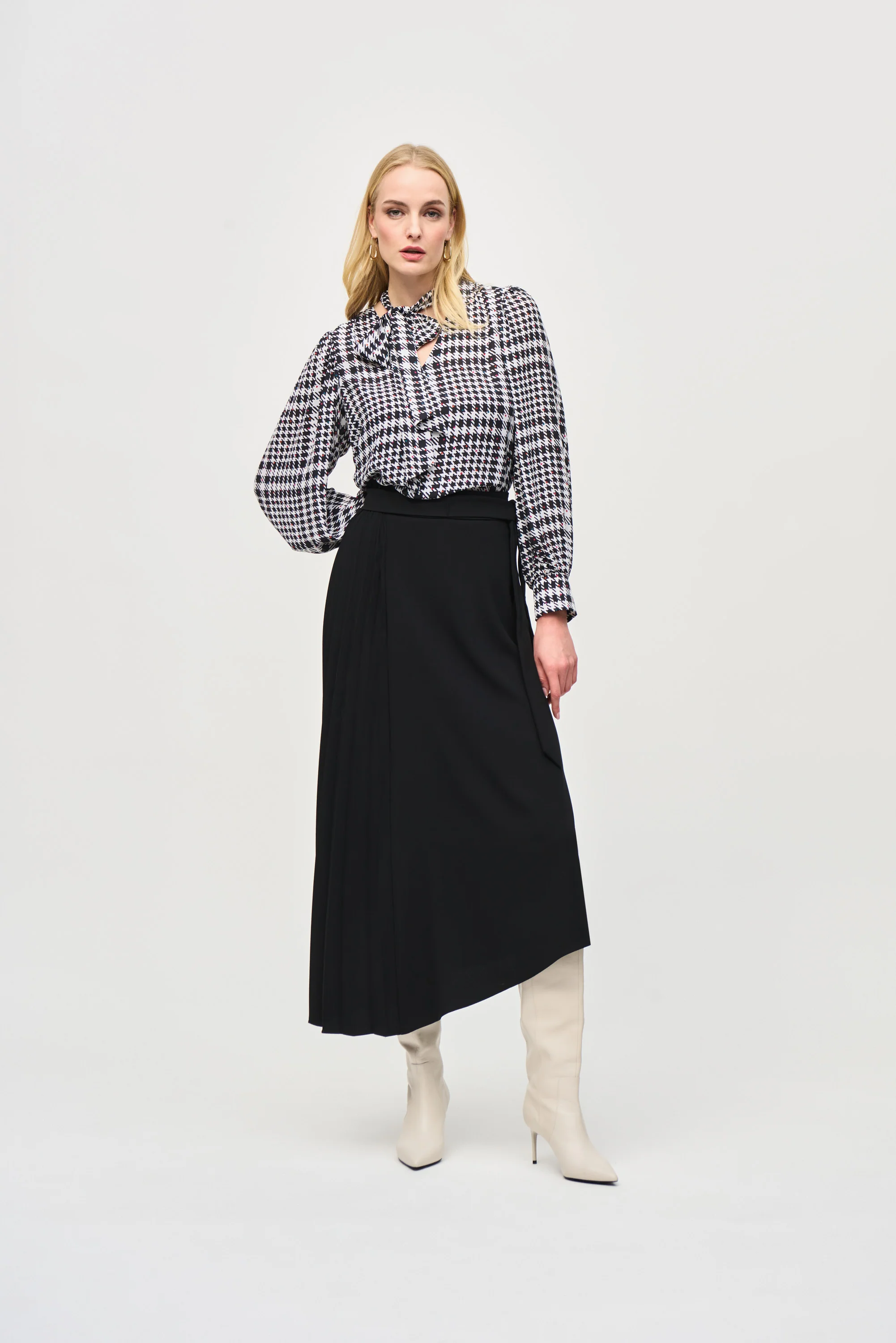 Embrace effortless style with a touch of modern edge in the Joseph Ribkoff Woven Crepe Asymmetrical Skirt (Style 243117). This statement piece combines classic elegance with a contemporary design, making it a versatile addition to your wardrobe.